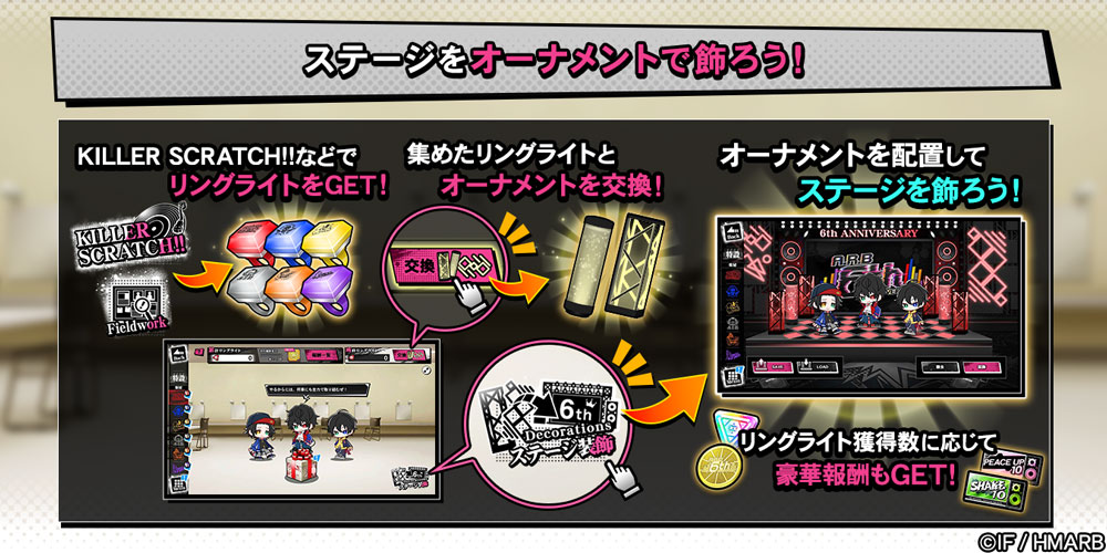 新たに「6th Anniv. Extra Stage」が登場しました。KILLER SCRATCH!!やフィールドワークなどで手に入る「リングライト」を「オーナメント」と交換してステージを飾り付けることができます。さらに「リングライト」の累計獲得個数に応じて、「6th Anniv. コイン」や「SHAKE Gコレクトチケット」などを獲得できます。
